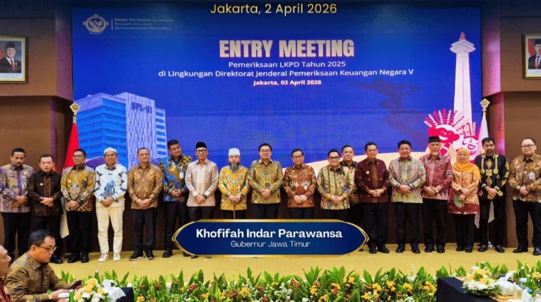 Jakarta, 2 APRIL 2026 – Gubernur Jawa Timur Khofifah Indar Parawansa menghadiri entry meeting pemeriksaan Laporan Keuangan Pemerintah Daerah (LKPD) Tahun 2025 di lingkungan Direktorat Jenderal Pemeriksaan Keuangan Negara V, BPK RI Jakarta, Kamis (2/4).