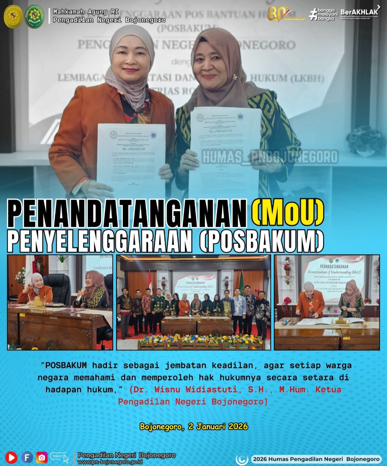 “Penandatangan (MOU) penandatanganan kontrak kerjasama untuk tahun Anggaran 2026 dilakukan setelah proses seleksi dan lelang. Yakni Pada tanggal 2 Januari 2026 Bertempat di Pengadilan Negeri kelas 1B Bojonegoro”