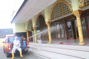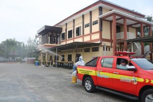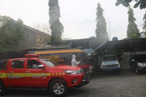 Seperti yang dilakukan Polres Bojonegoro melakukan penyemprotan cairan disinfektan di lingkungan Mapolres, ruang pelayanan, barak anggota dan asrama yang di huni personil Polri – ASN.